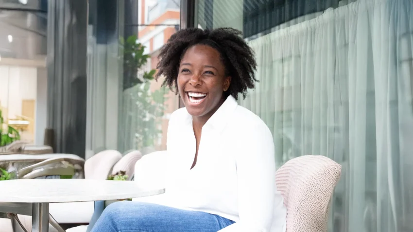 Portrait of TJ power sitting on a chair with illustrations over him portraying joy.